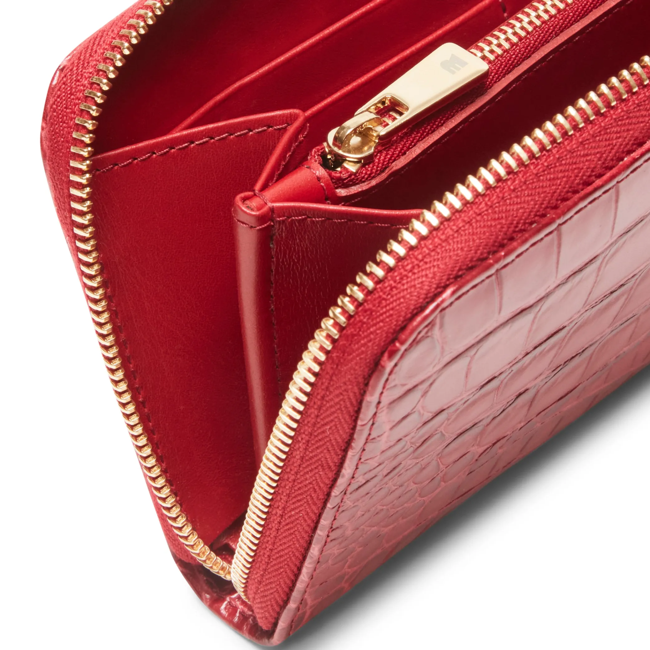 Portafoglio zip around su tre lati realizzato in morbida pelle stampata effetto coccodrillo lucido. Internamente suddiviso in due scomparti per banconote. otto fessure per tessere. due tasche piatte e una tasca portamonete centrale con zip. L’interno