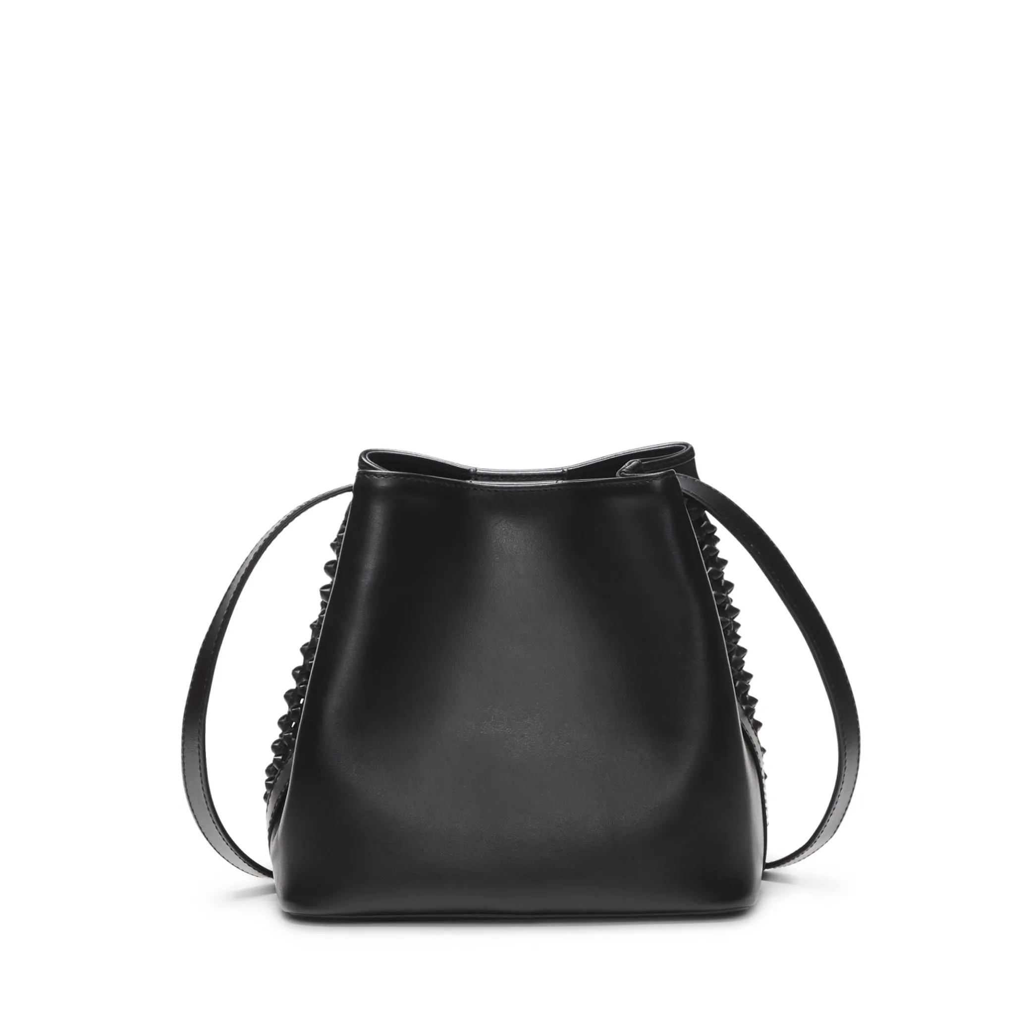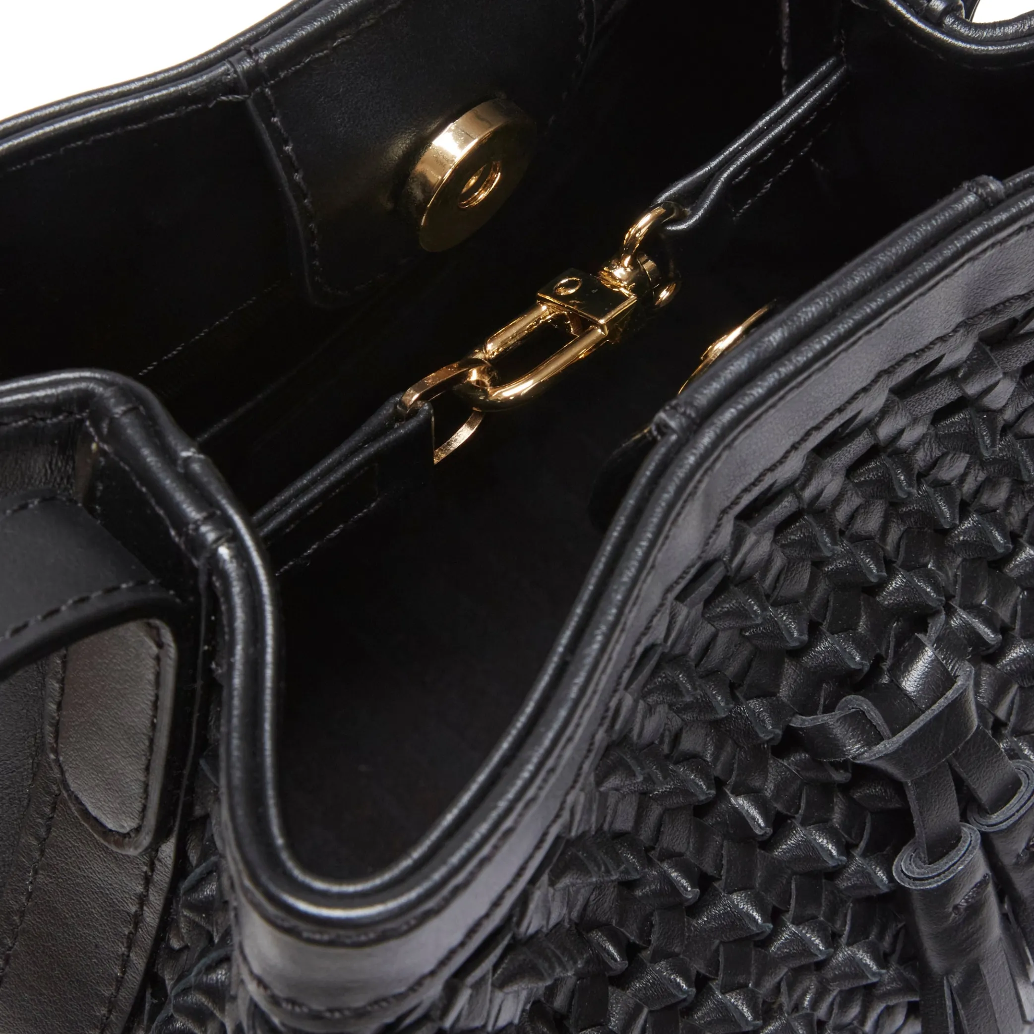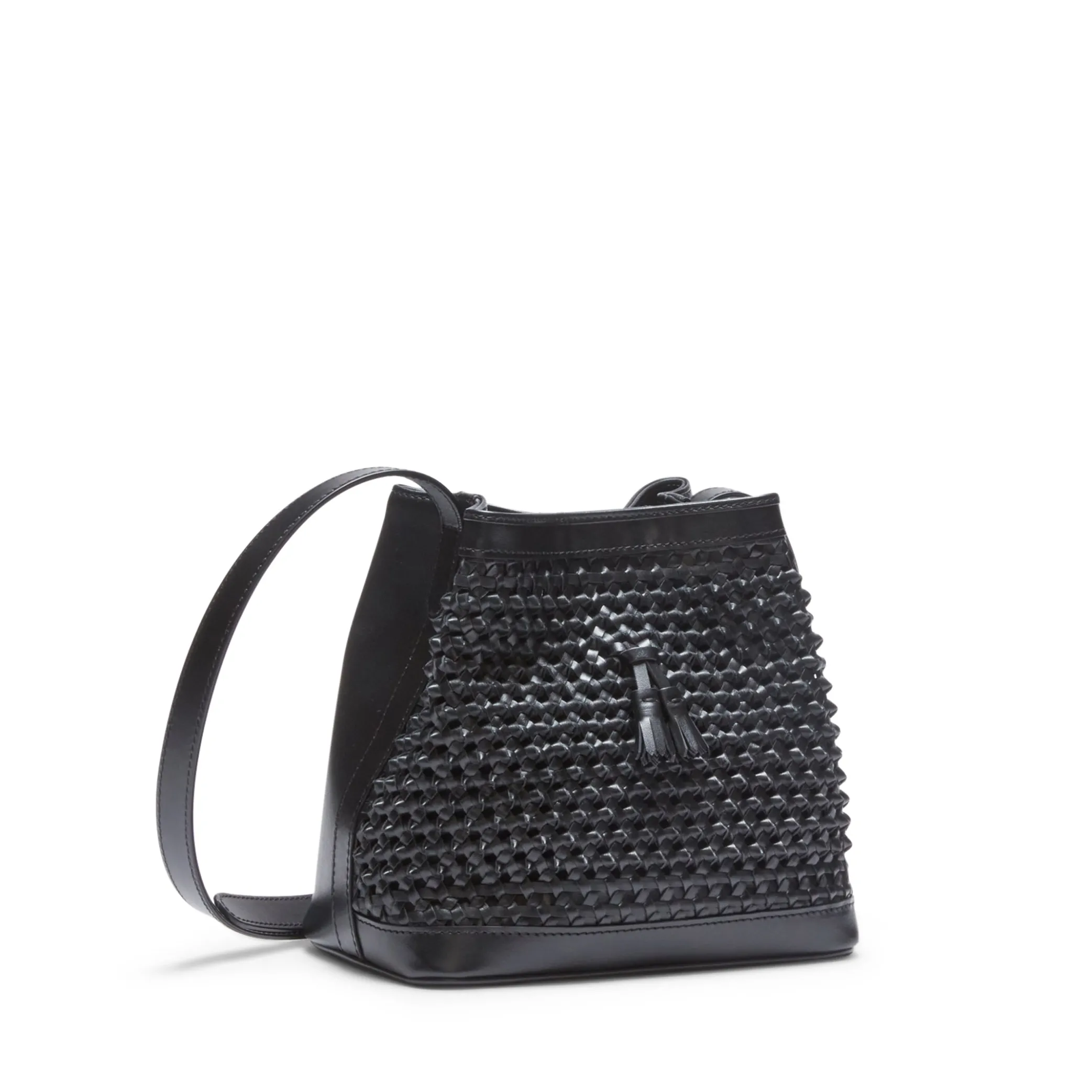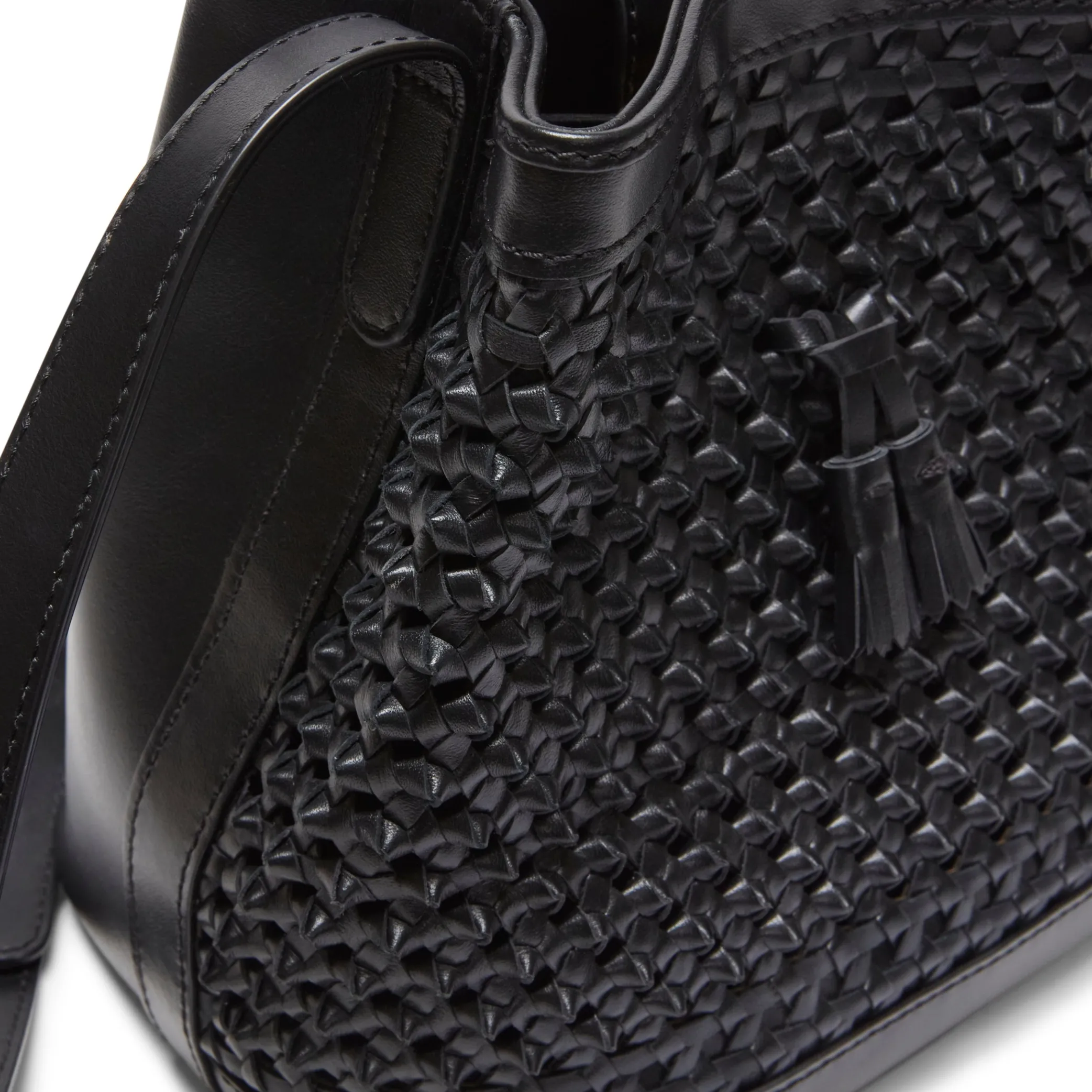 Bucket bag with iconic tassels made of soft leather with a nappa effect. The special woven design is enhanced by small leather knots. Perfect for making any look more chic and exclusive. Drawstring fastening. H21xL21xW13