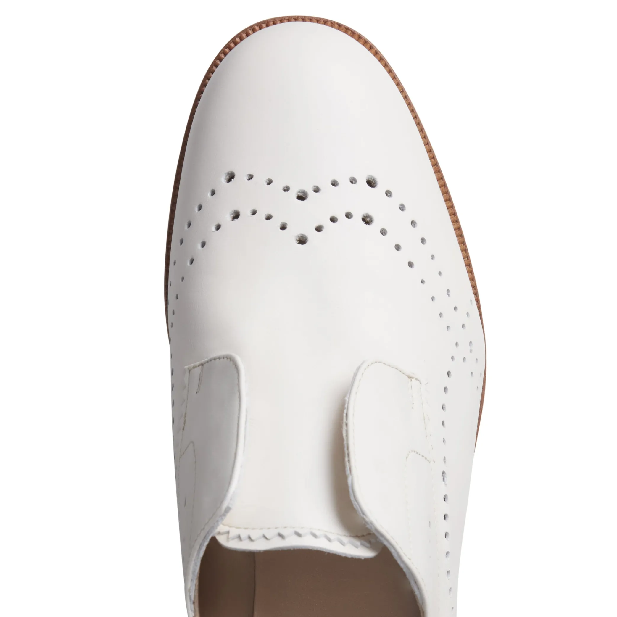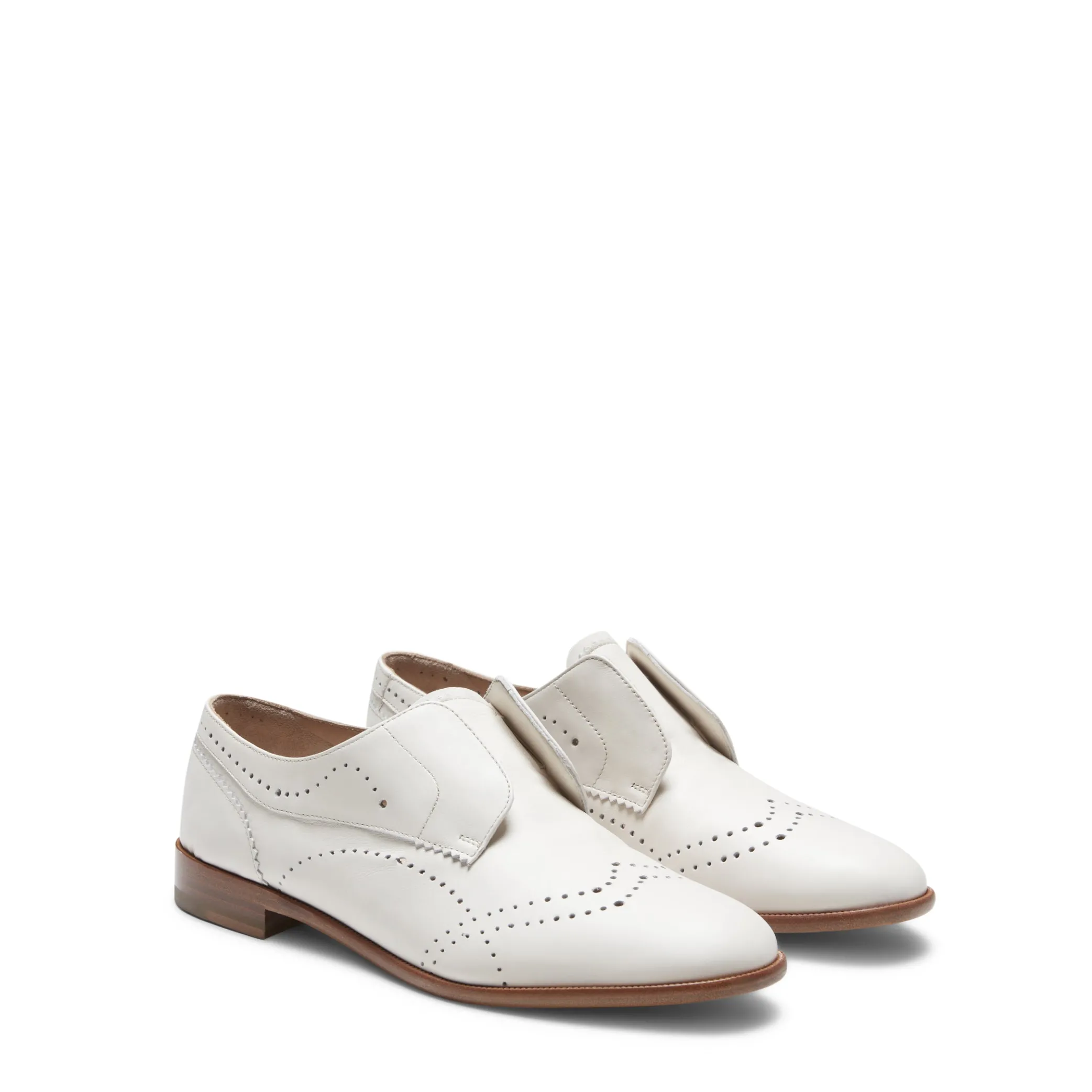 Laceless derby shoe with a slightly elongated shape, made of soft, unlined smooth leather with holes that form a flower on the toe. The perfect combination of androgynous style and refined details.