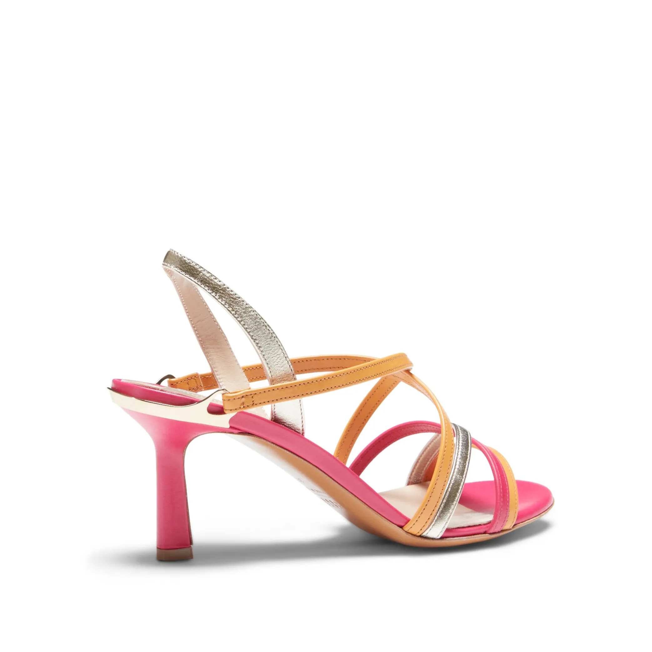 The sophisticated, feminine Magenta sandal with the iconic light gold stirrup. Made of soft leather in a sophisticated colour combination, featuring small interwoven bands that wrap around the foot. 70 mm leather-covered heel.