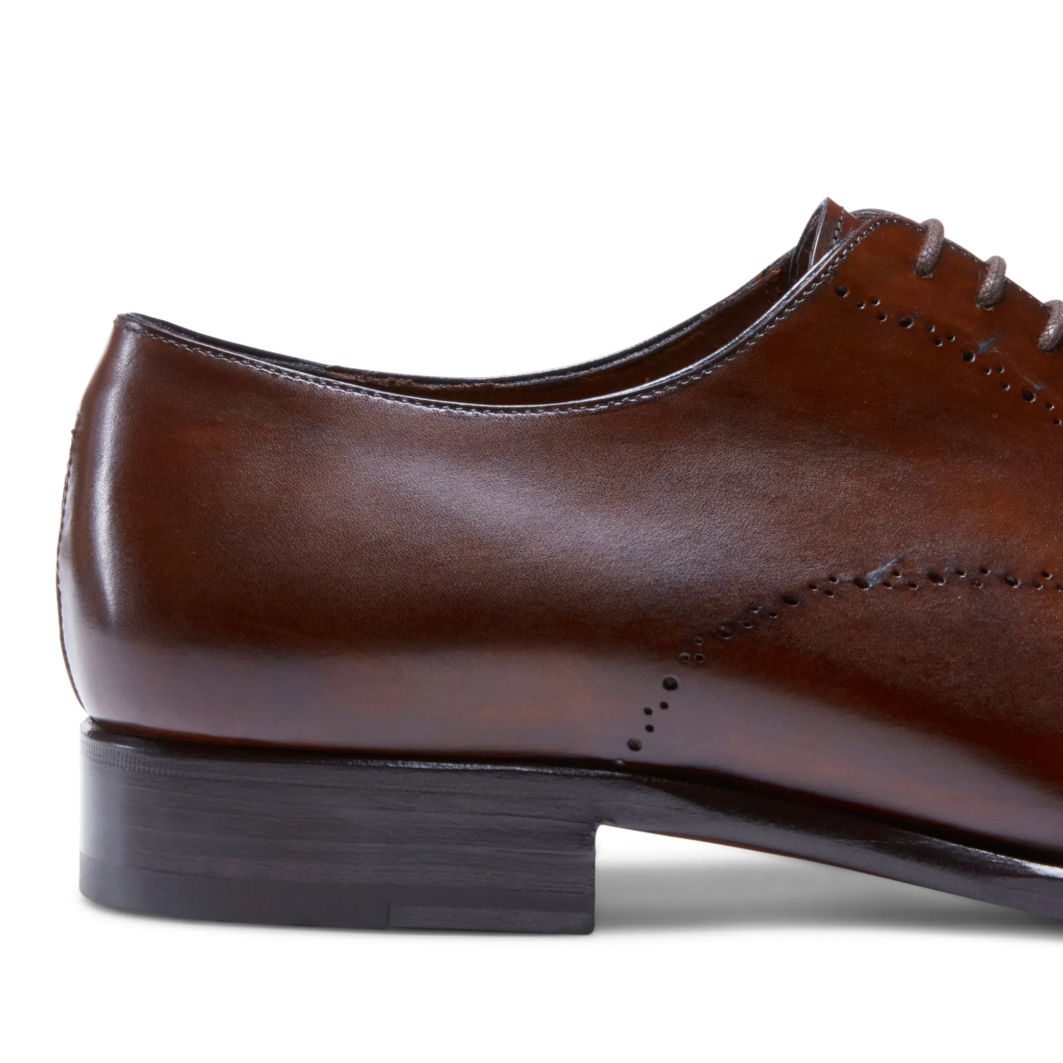 Timeless elegance stands out in this tapered Oxford shoe. Made of soft leather with a gradient appearance, thanks to the artisanal dyeing process. The perforations embellish the toe and the edging on the upper. Leather sole.