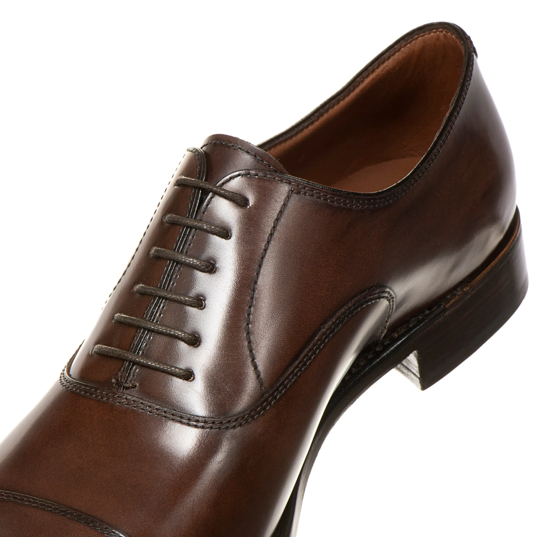 Anglo-Saxon-inspired cap toe Oxford shoe made of soft brushed calfskin to produce light and dark effects. The Goodyear welt ensures comfort and durability.