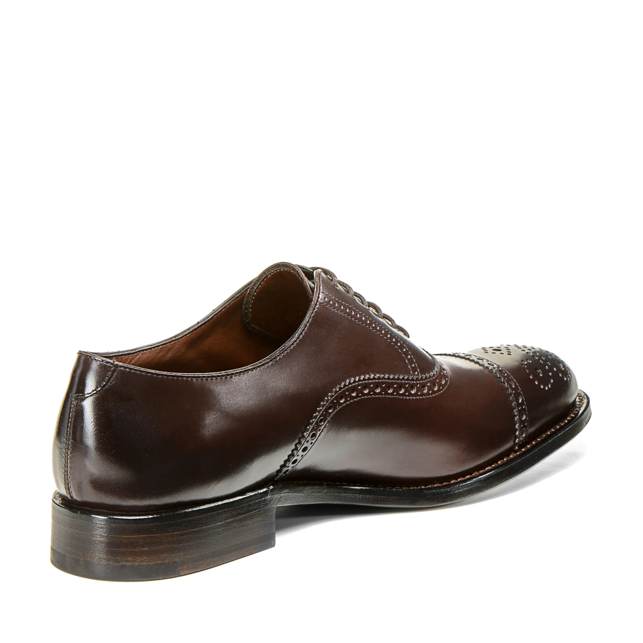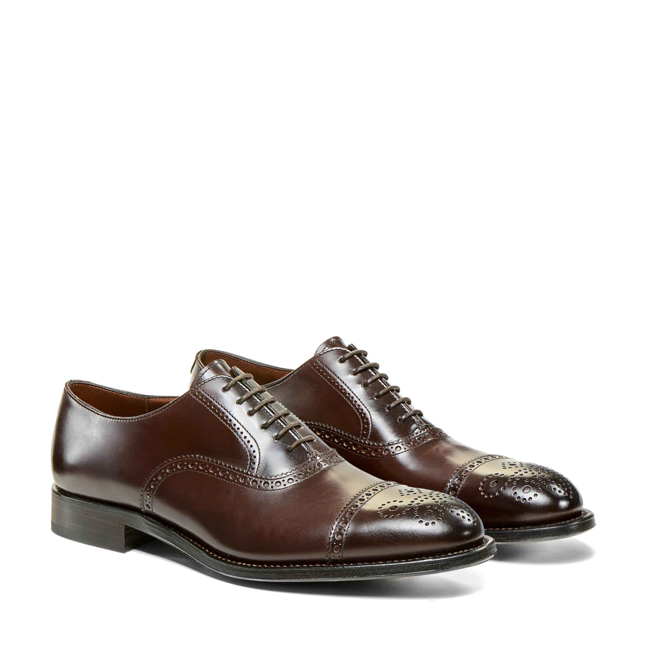 Cap toe Oxford shoe made of calfskin. The special treatment applied by our master craftsmen gives the leather a shiny effect. The upper recalls the style of the Anglo-Saxon Oxford shoe with jagged edging and holes. Leather sole.